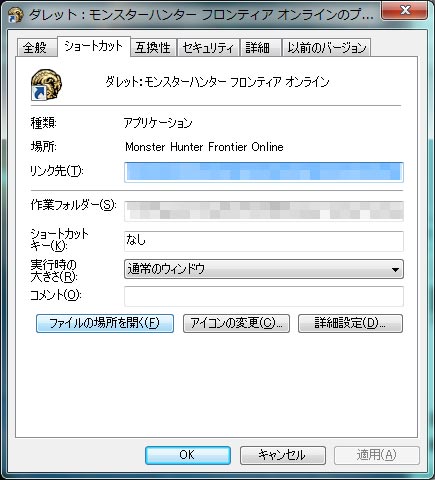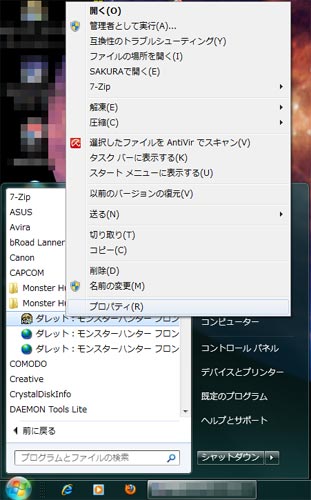 - デスクトップ上のMHFショートカット、またはスタートメニュー内のMHFショートカットを右クリックする